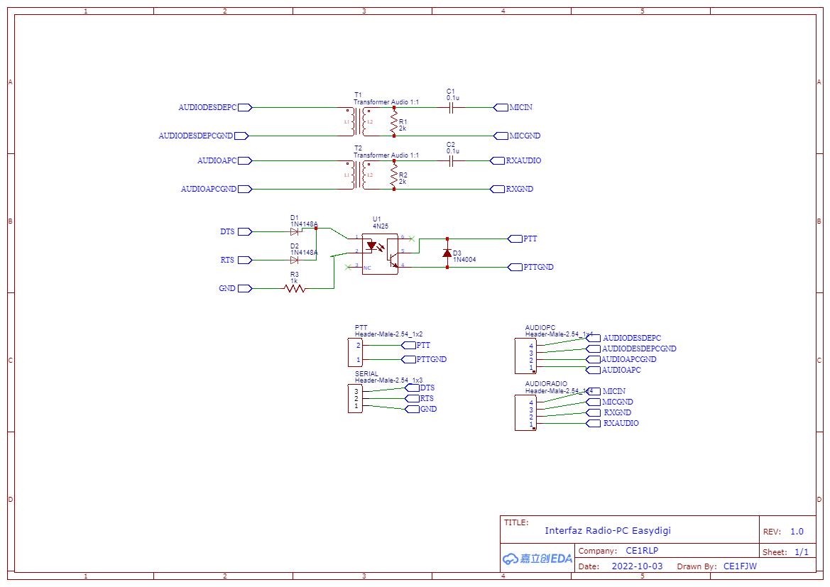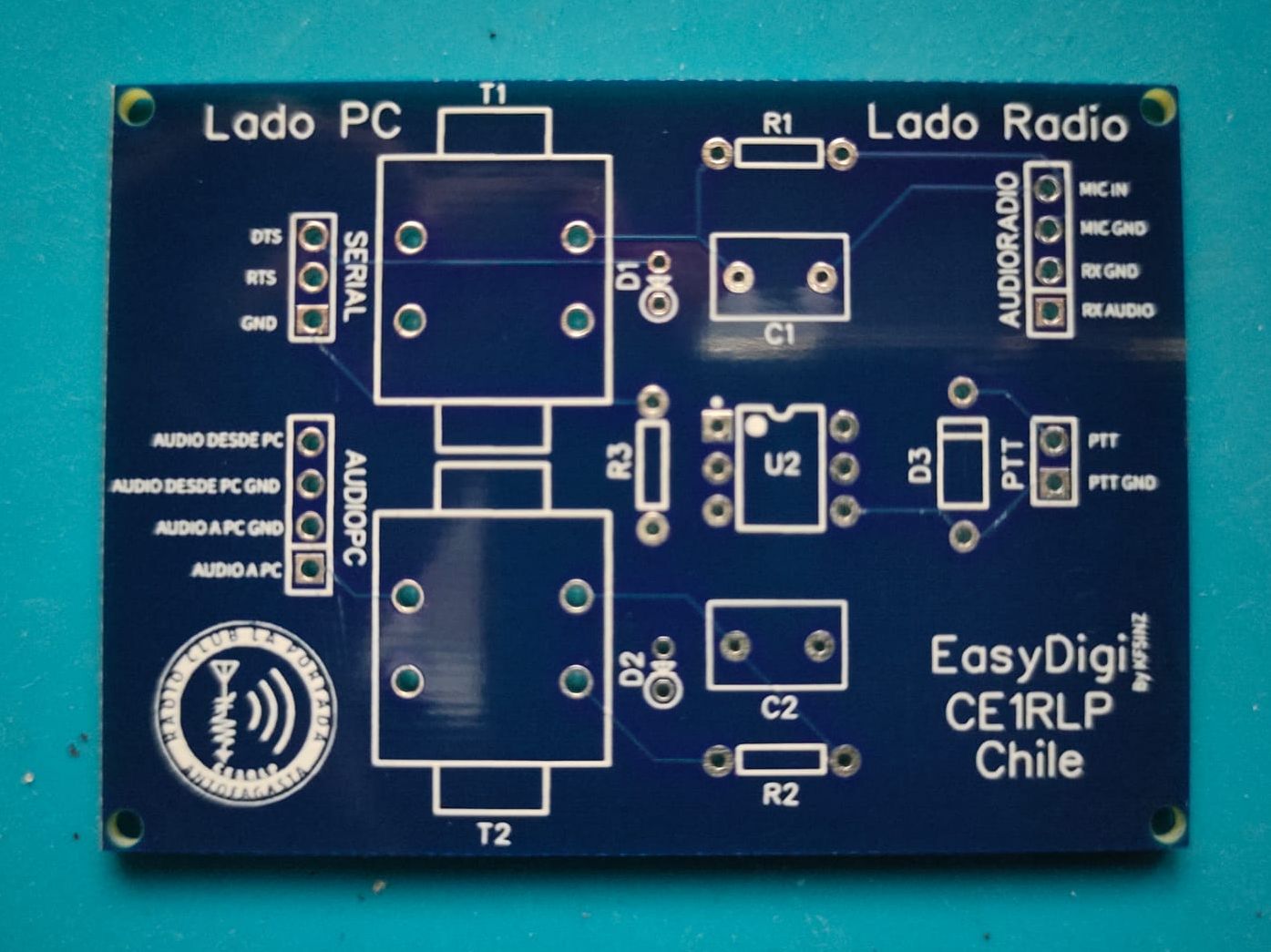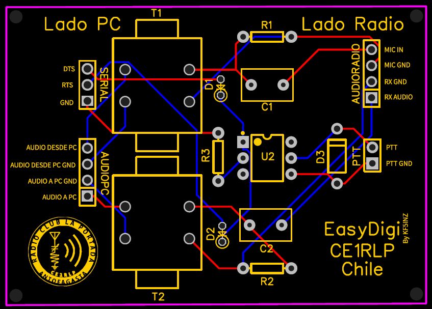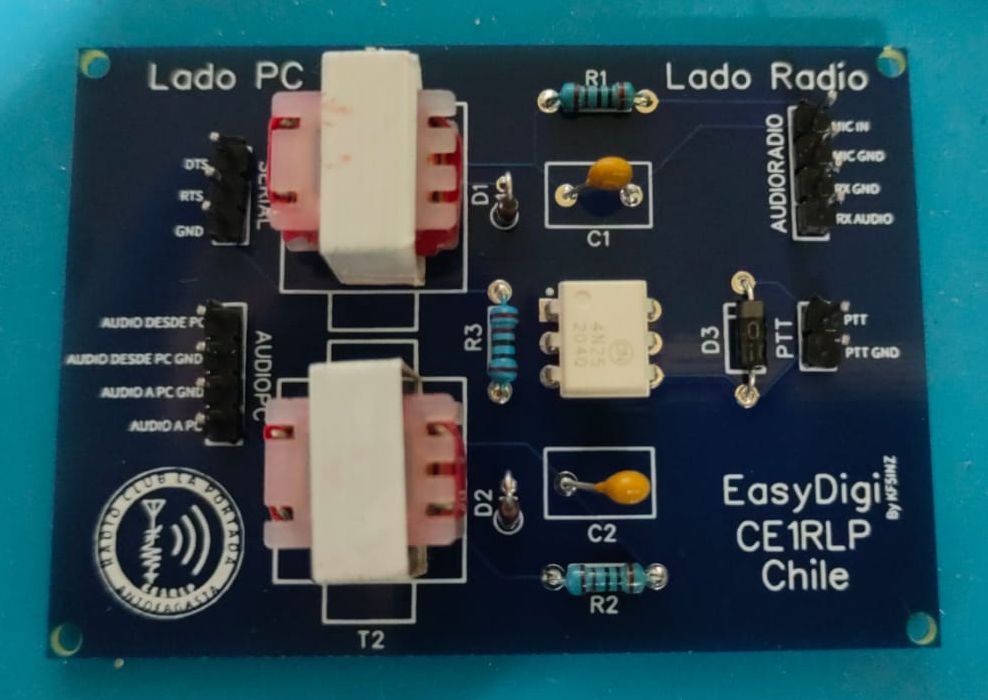 CE1RLP ha hecho una adaptación del "EasyDigi" de KF5INZ, interfaz que permite de forma fácil, mantener en una placa la aislación tanto del audio como el control de la transmisión (PTT) entre el computador y la radio. este kit es suministrado de forma gratuita a nuestros socios.